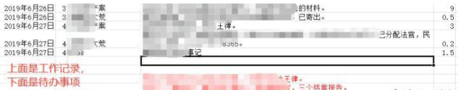 此外,工作記錄表還可以作為待辦事項來使用。當律師需要給自己安排一項將來需要完成的任務(wù)時,只需在工作記錄表將來時間的空白處記下該任務(wù),提醒自己需要完成。